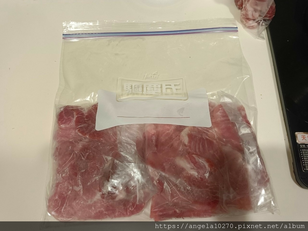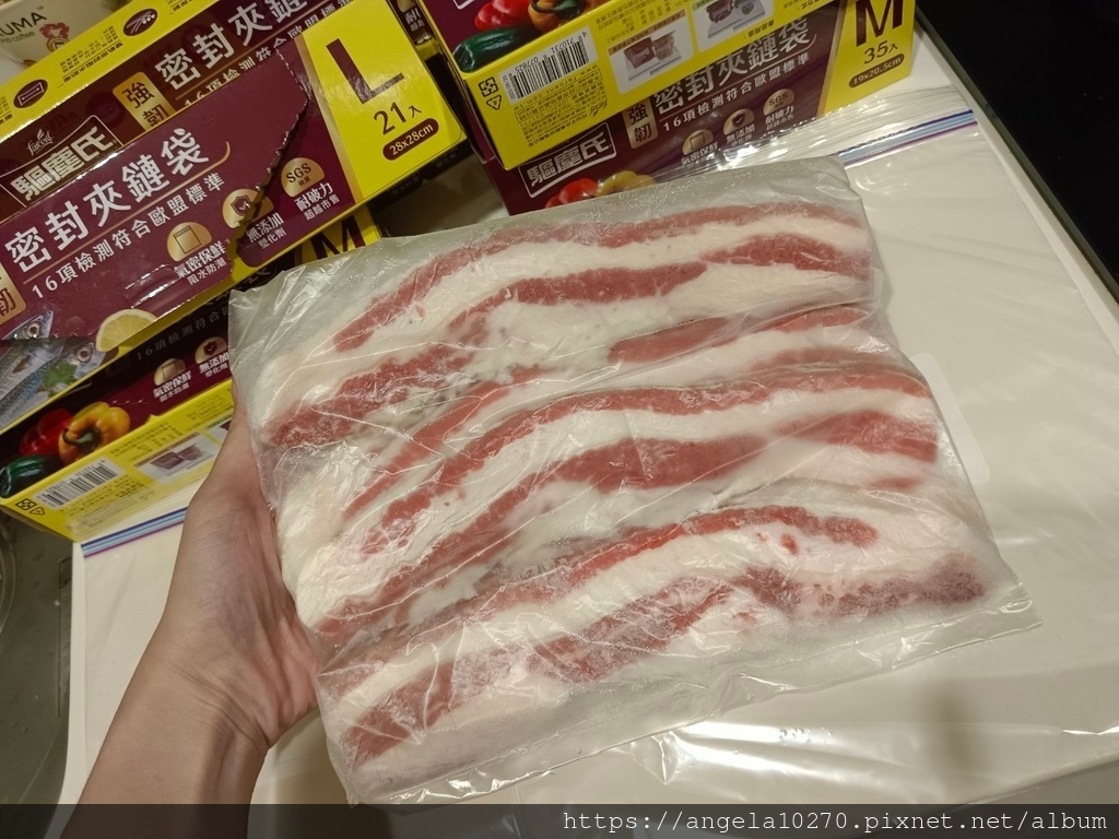團購買的一大盒牛五花肉片 我們可以先用一般袋子先分裝成數袋
